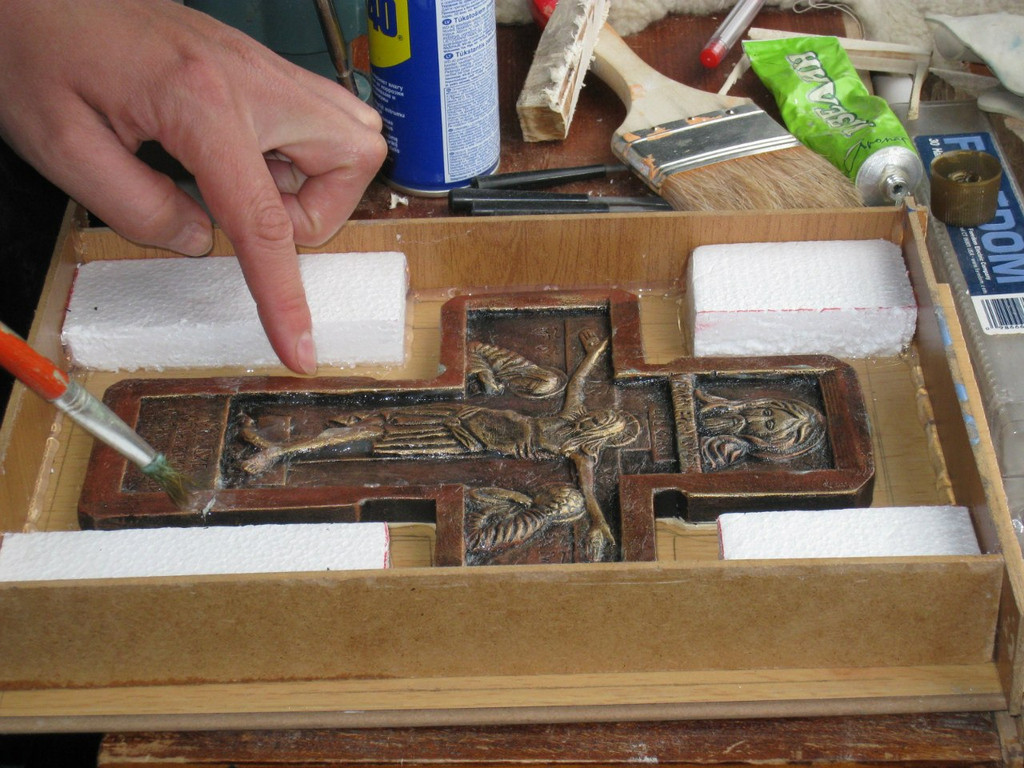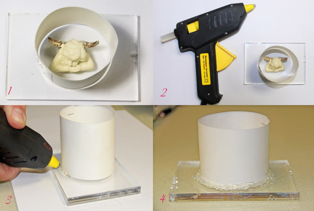 Важные моменты: 1. Должны быть заделаны все щели для предотвращения протекания силикона (мы используем термопистолет). 2. Модель должна быть прикреплена ко дну во избежания всплывания и смещения при заливке сликоном для форм.